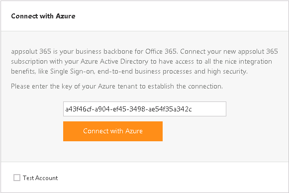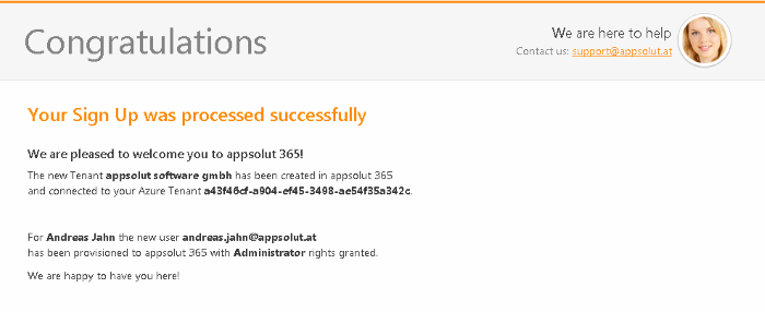 To be able to use appsolut 365 with all the nice features, like Single Sign-on with Office 365 and high security of Azure Active Directory, you'll need to finalize the registration process in your Azure tenant. Please visit How To: Finalize Signup in Azure to get more information.